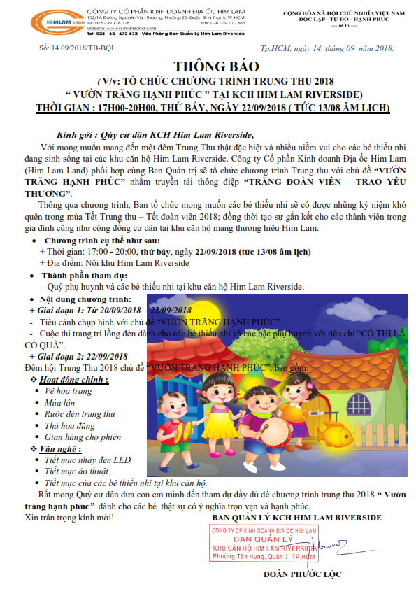 Thông báo: V/v Tổ chức Trung thu 2018 tại KCH Him Lam Riverside 19/09/2018 Chia sẻ Bài Viết khác 15/10/2019 Tổ chức thành công Hội nghị Nhà chung cư Him Lam Riverside năm 2019 10/10/2019 THÔNG BÁO V/v: Tổ Chức Hội Nghị Nhà Chung Cư Thường Niên Năm 2019 Tại Tòa nhà Chung Cư Him Lam Riverside. 18/01/2019 Thông báo: V/v Vệ sinh bồn và hầm nước sinh hoạt tại Khu căn hộ Him Lam Riverside 2019 15/01/2019 Thông báo: V/v Vệ sinh kính mặt ngoài các Block tại KCH Him Lam Riverside 23/12/2018 Thông báo: V/v Dịch vụ Ông già Noel trao quà Giáng sinh cho các bé thiếu nhi tại KCH HL Riverside